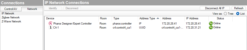 In order to communicate with the Pharos Controller, you will need to configure the IP address of the Pharos Controller in Composer Pro under Connections, in the Network tab.