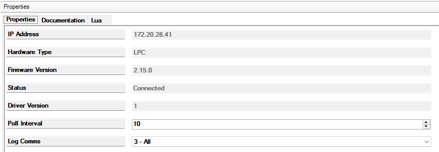 After the Pharos Controller is linked to the Control4 system the driver's property page will be populated with the Controller information: