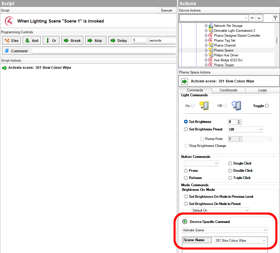 You can react to changes of the active scene in a space by selecting Pharos Space in the Device Events pane of the Programming view. You can then script actions in response to the active scene changing.