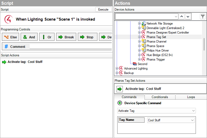 You can react to changes of the active tag in a tag set by expanding the Pharos Tag Set in the Device Events pane of the Programming tab. You can script actions in response to the active tag name or number changing.